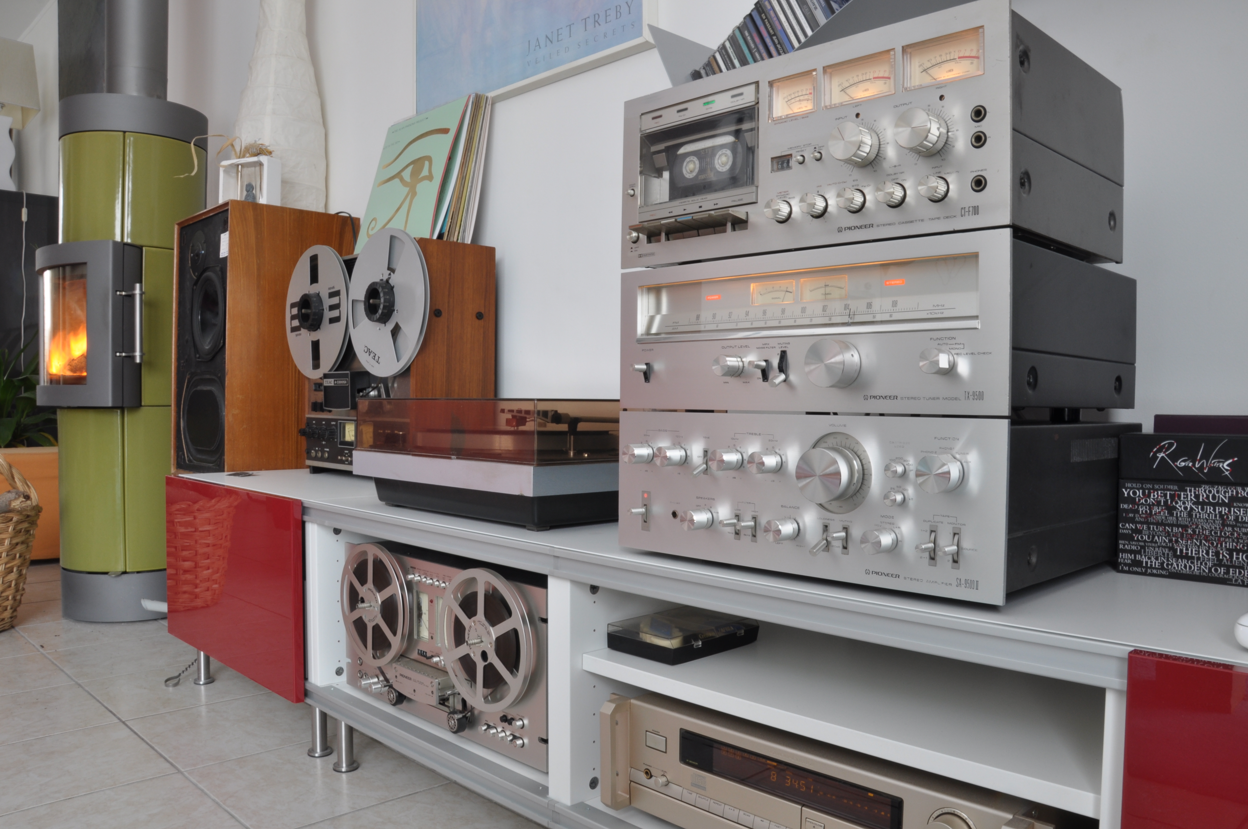 Pioneer SA9500II, TX9500II, CT-F700, Marantz CD-R1, Barthe rotofluid avec Nagaoka MP11, Technics RS1500US, B&W DM70, Nakamichi 700tri tracer et HIGHCOM II