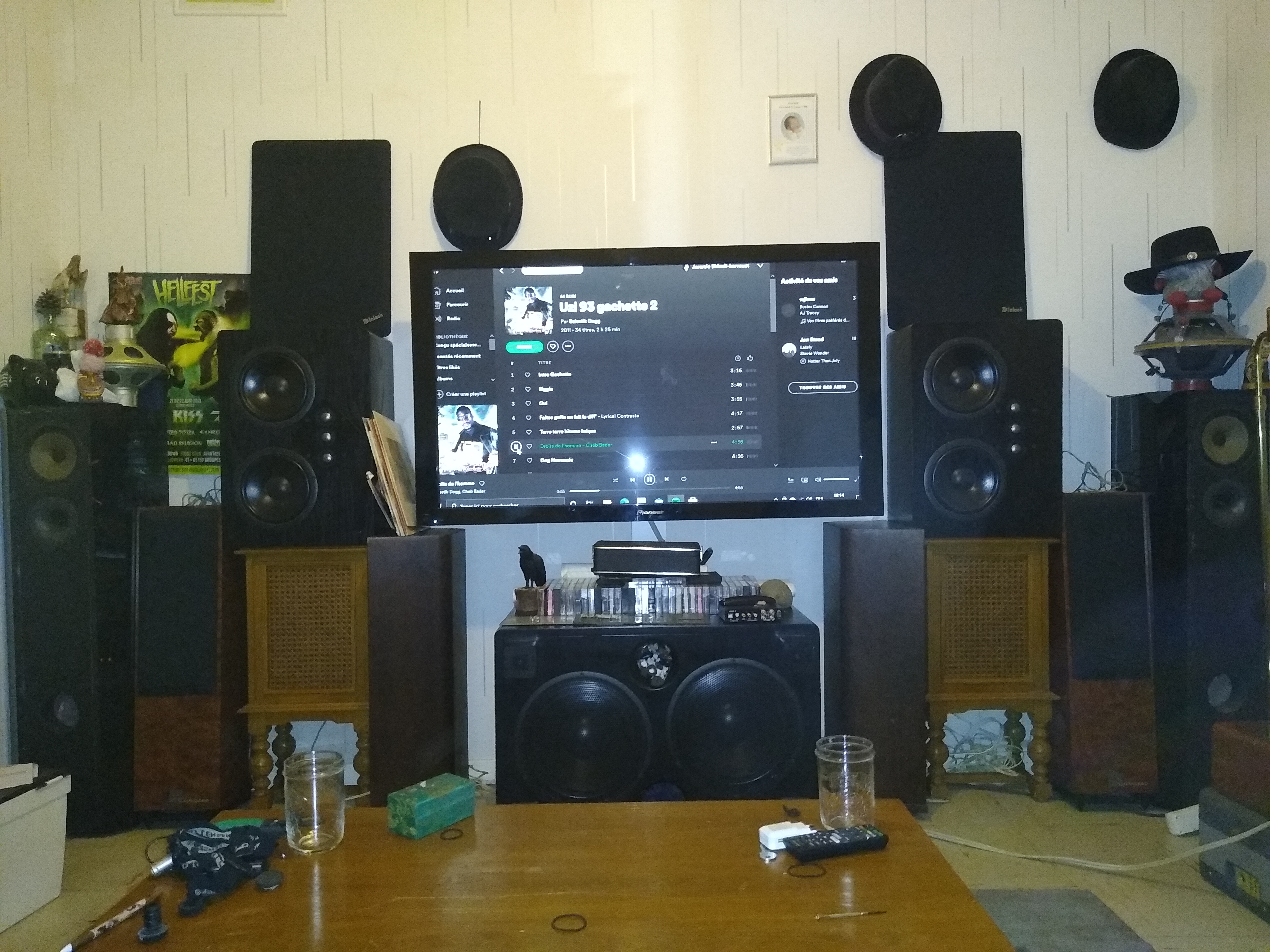 Je possède le kit 5.1 complet McIntosh composé de 3 HT1 de 2 HT3 et d'un HT2. Je possède aussi en enceintes des triangles Zenith 2, des cabasse Jonque 301, des Advent the smaller, des Philips RH celles avec le tweeter au dessus, des Philips AD5046N, des missions by B&W le plus petit modèle et des enceintes allemande me servant de pied d'enceinte.